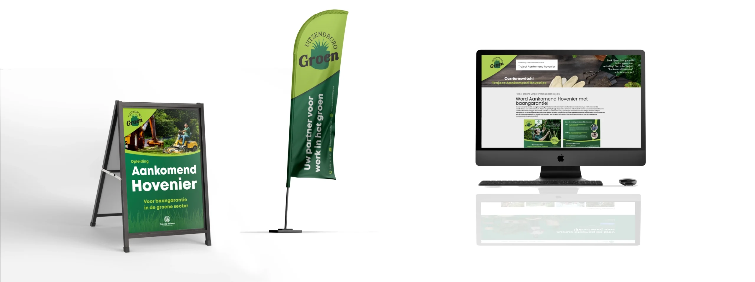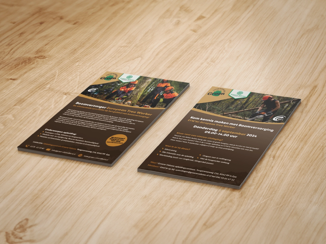 Groen uitzendburo, ja met traditionele spelling 😉 is het uitzendburo voor mensen met groene vingers, ze bieden elk jaar verschillende kansen voor buitenmensen. Elke jaar houden ze praktijkdagen, kennismakingen en opleidingstrajecten. Wil je werken als hovenier of boomverzorgen, maar geen idee waar je moet beginnen. Groen Uitzendburo regelt de gehele opleiding en biedt vaak zelfs baangarantie. Voor deze opleidingen en trajecten werken ze samen met hun opleidingscentrum Groene Veluwe, waar wij ook projecten voor draaien. Want al deze dagen en opleidingen moeten wel gecommuniceerd worden. Wij maken flyers, brochures, sociale media post en verschillende uitingen zoals vlaggen beurstands en bussen.Â